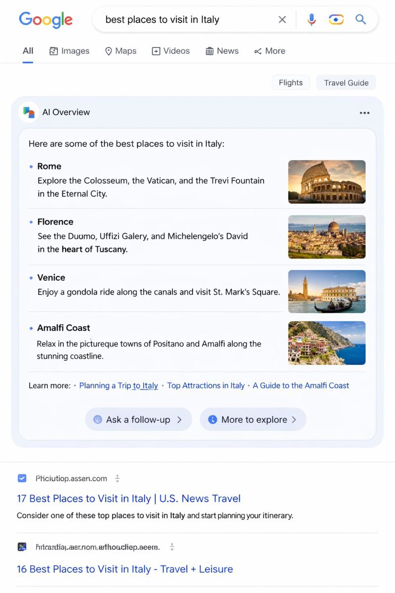 For travel brands, this means mentions in trusted sources such as Travel + Leisure, Condé Nast Traveler, AFAR, Lonely Planet, and strong regional publications will increasingly influence whether — and how — AI systems recommend you.