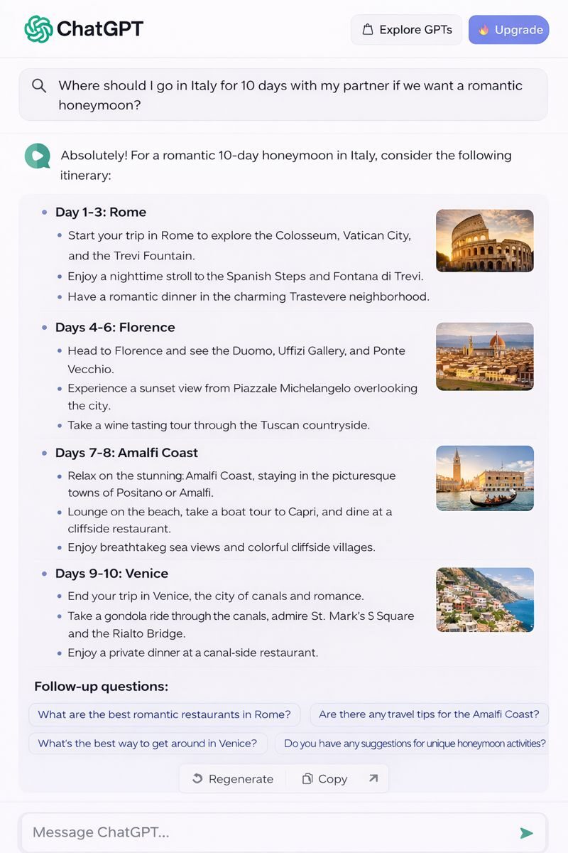 - Explore travel-related prompts to see how AI compares options and explains destinations.